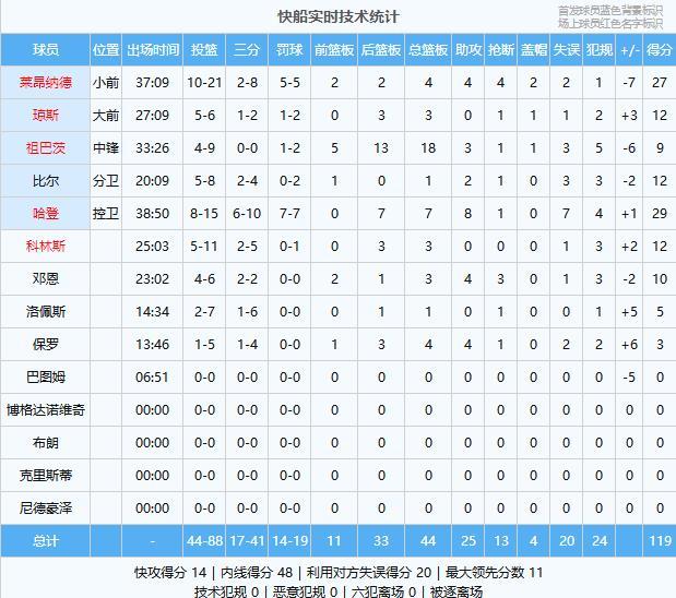 快船数据(主队):哈登29分7板8助、莱昂纳德27分4板4助4断2帽、琼斯12分3板、科林斯12分3板、比尔12分1板2助、邓恩10分3板4助3断、祖巴茨9分18板3助、洛佩斯5分1板、保罗3分4板4助